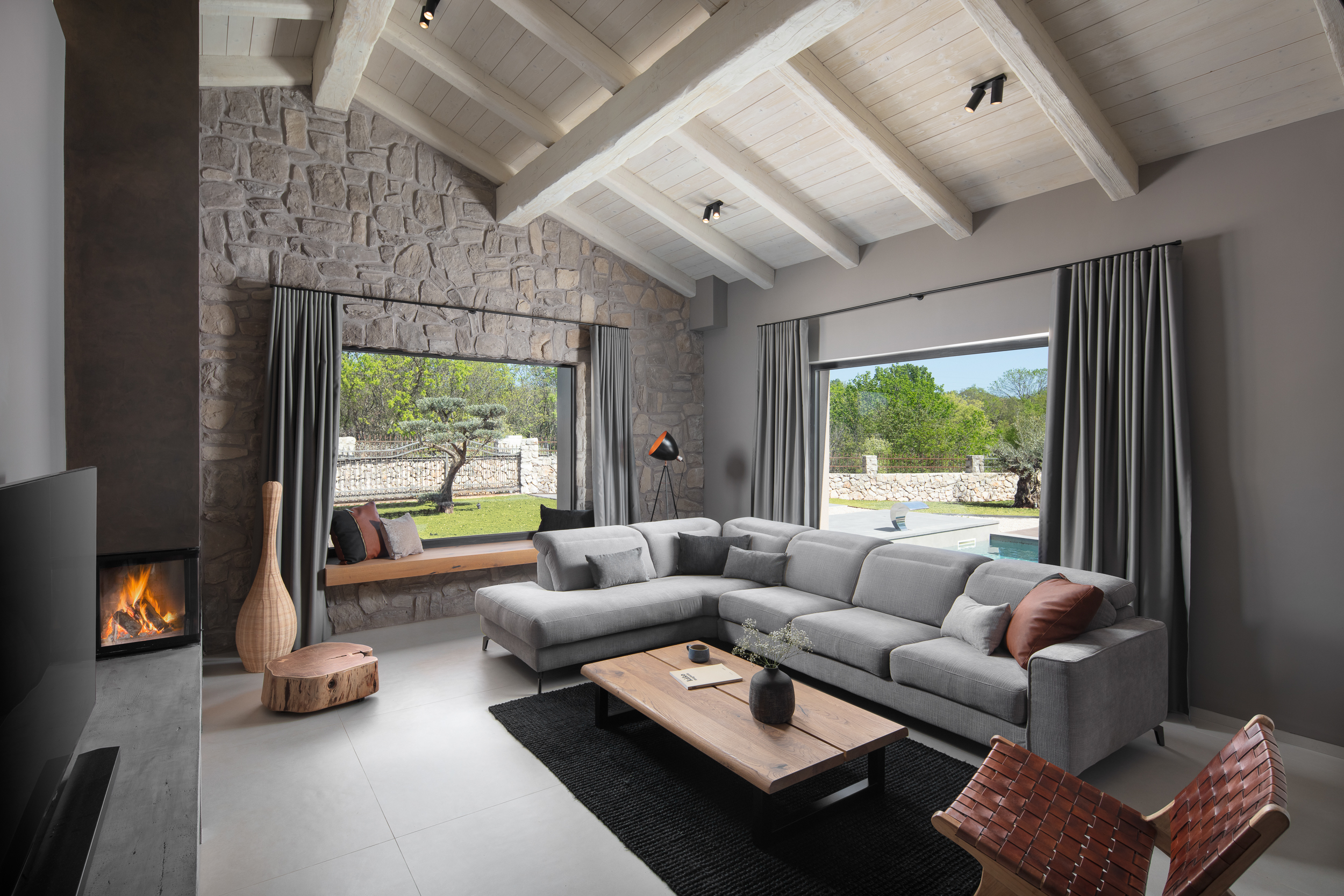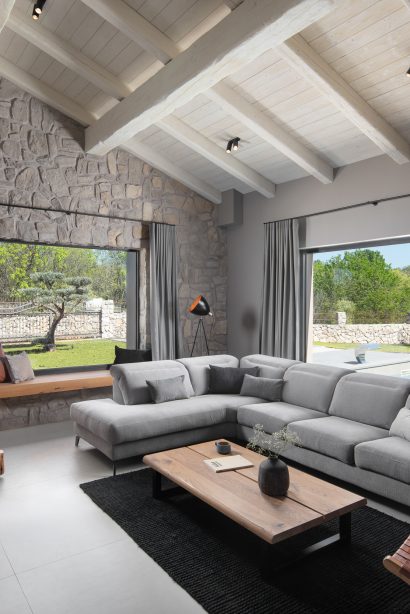 Villa Capri na otoku Krku predstavlja izvanrednu kombinaciju modernog i rustikalnog dizajna te arhitekture. Njezin karakter očarava spoj suvremenih elemenata s tradicionalnim što stvara jedinstvenu estetiku koja istovremeno osvaja srca ljubitelja i modernog i klasičnog stila. Posebno je istaknuto to što tri strane kuće imaju fasadu od punog kamena, dodajući još više šarma i autentičnosti njezinom vanjskom izgledu.